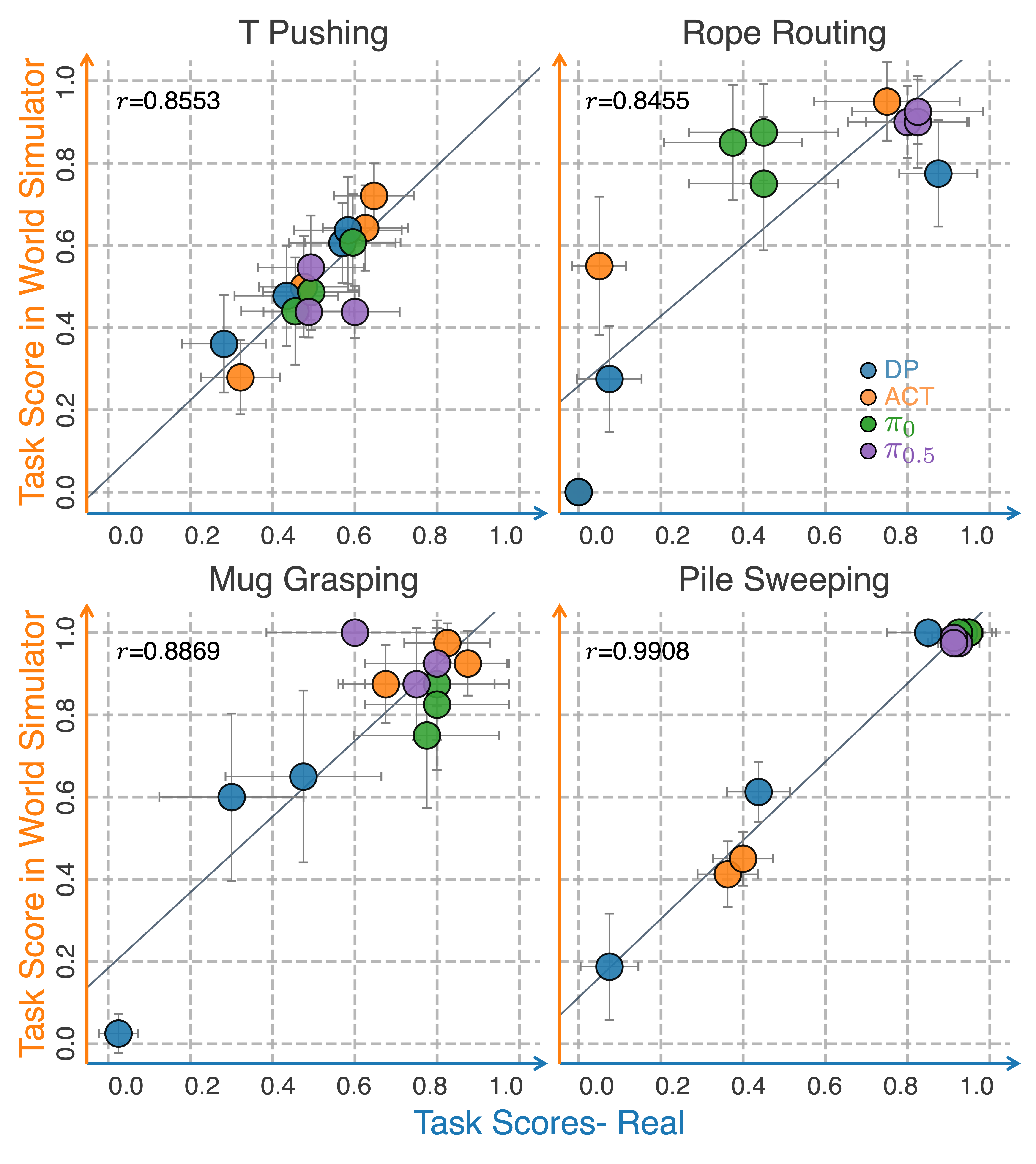 To quantitatively verify this, we evaluate four policies (DP, ACT, π0, π0.5) across four tasks, measuring task scores both inside the world model and on the real robot, under identical conditions across all policies and checkpoints. We make sure comparisons are fair by ensuring the same initial configurations within both real world and world model. In the following figure, each point corresponds to a policy checkpoint evaluated under identical settings. We observe strong positive correlations, indicating that evaluation within our world simulator faithfully reflects relative policy performance in the real world.