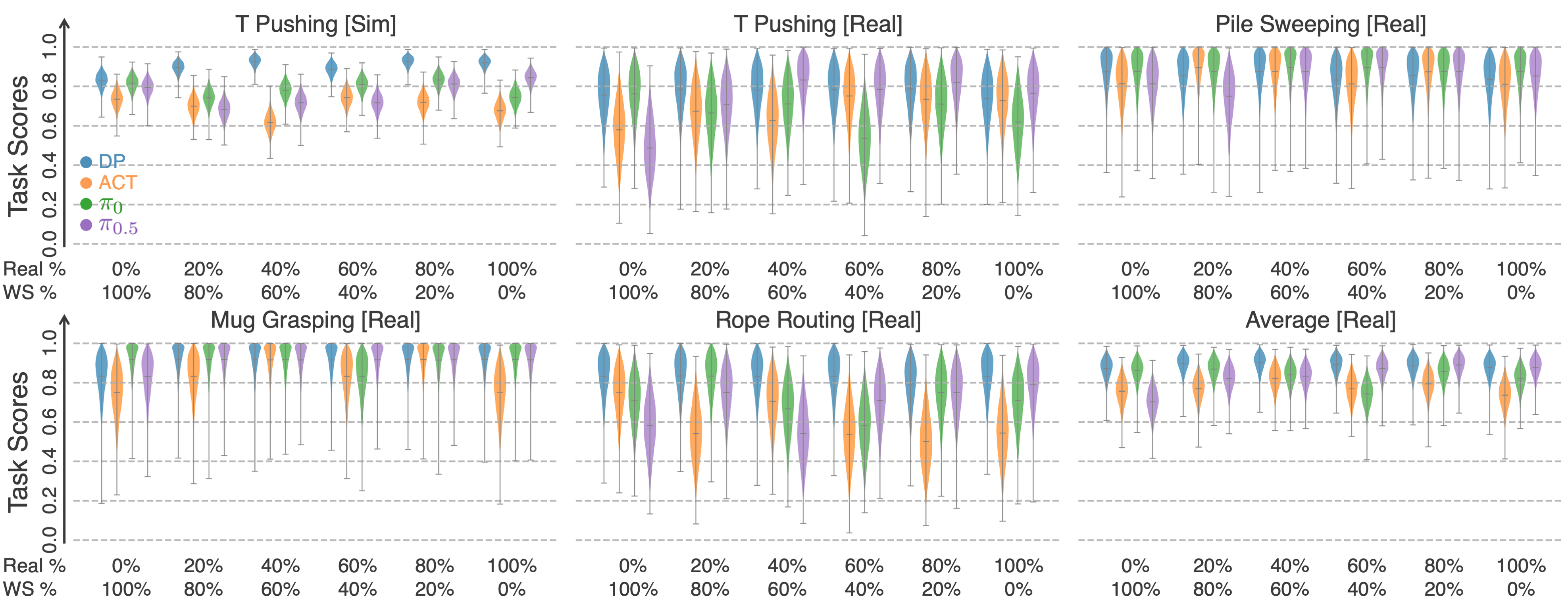 To quantitatively study the generated data quality, we benchmark four imitation learning policies, including DP, ACT, π0, and π0.5, across five manipulation tasks: T pushing (in MuJoCo simulation and in the real world), pile sweeping, mug grasping, and rope routing. For all experiments, we fix the total dataset size at 100 demonstration episodes and vary the proportion of generated data versus real-world data in the training set, sweeping across the full spectrum from 0% to 100% world-model data. We find that performance remains comparable across the entire data mixture spectrum, indicating that our world-model data quality is comparable to real-world data for imitation policy training.